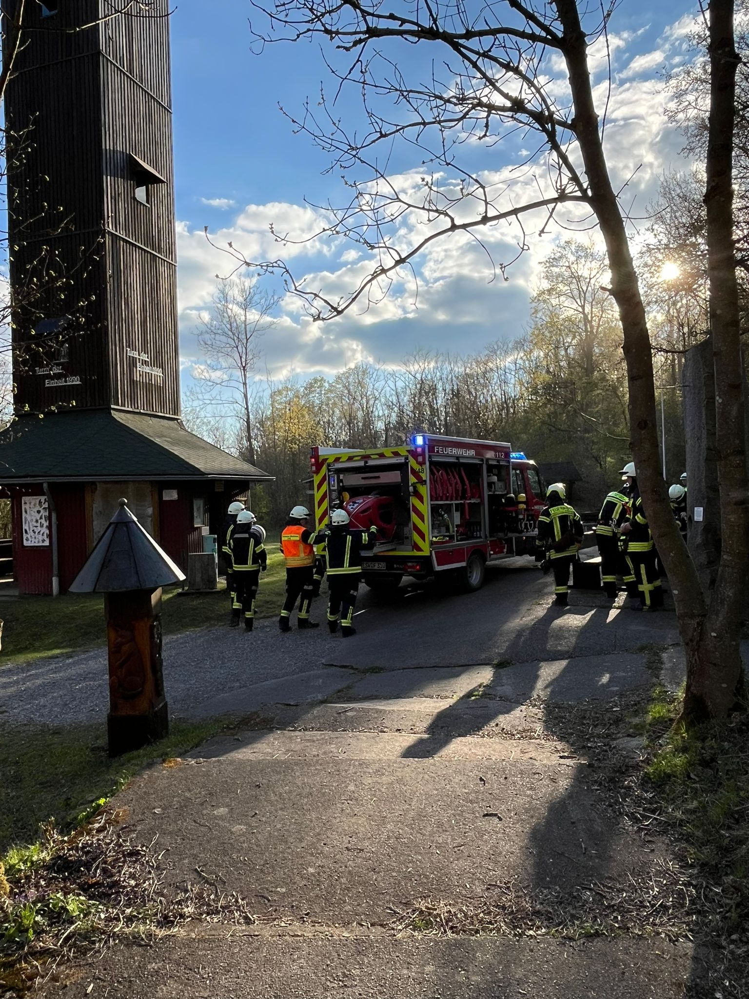 Das Übungsgelände wurde dankenswerterweise von der Interessengemeinschaft Heldrastein zur Verfügung gestellt. Schnell zeigte sich, dass das Objekt besondere Anforderungen an die Einsatzkräfte stellt: Die steile und enge Treppenanlage des Turms erschwerte die Rettungsmaßnahmen erheblich. Insbesondere unter schwerem Atemschutz waren die Kameradinnen und Kameraden körperlich stark gefordert, da sowohl der Aufstieg als auch die Rettung der Vermissten höchste Konzentration und Ausdauer verlangten.